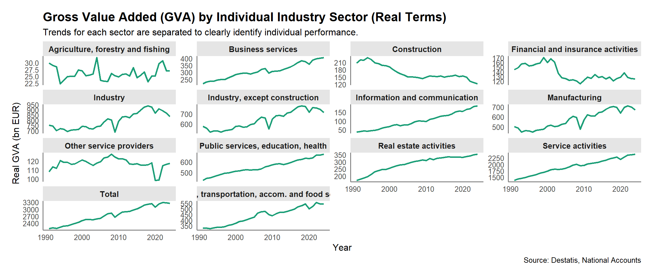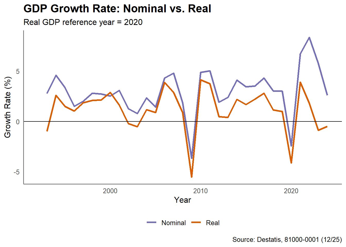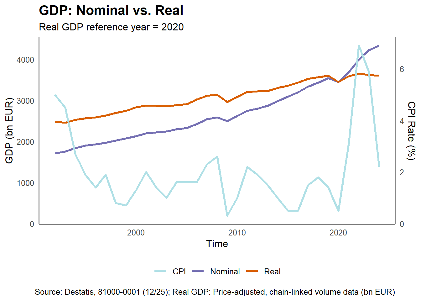 caption = "Source: Destatis, 81000-0001 (12/25); Real GDP: Price-adjusted, chain-linked volume data (bn EUR)"