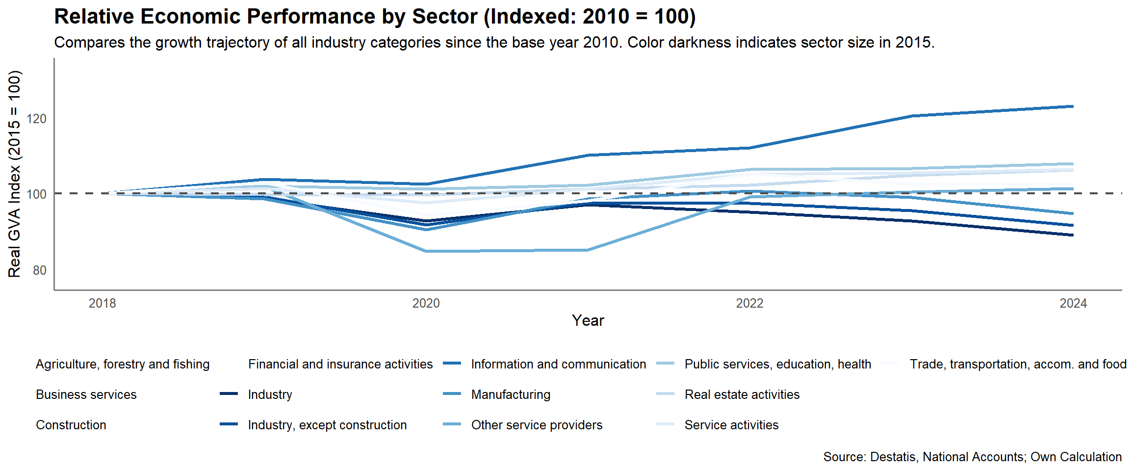 title = "Relative Economic Performance by Sector (Indexed: 2010 = 100)",